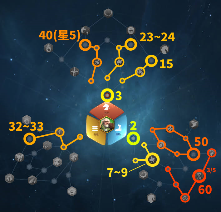 中に数字が書かれた丸で囲まれた天賦を、横に書かれた指揮官レベルで取得します。★5と★6は、指揮官レベルだけでなく星レベルをそこまで上げる必要があることを意味します。天賦を取得する順番については、次項の表の説明で書きます。